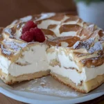 Bestimmt hast du noch die ein oder andere Frage zu diesem Rezept. Das ist ganz normal, ging mir am Anfang auch so. Kann ich auch gefrorene Himbeeren nehmen? Ja, das geht super! Lass sie aber am besten vorher auftauen und gut abtropfen, damit die Füllung nicht zu wässrig wird. Und was, wenn der Kuchen Risse bekommt? Das ist nur ein kleiner Schönheitsfehler und passiert oft, wenn er zu schnell abkühlt. Lass ihn einfach langsam im ausgeschalteten Ofen abkühlen, dann passiert das seltener. Und ja, du kannst den Kuchen auch super einfrieren. Am besten schneidest du ihn vorher in Stücke, dann kannst du immer genau so viel auftauen, wie du gerade brauchst.
